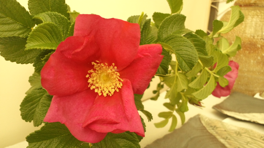 バラ科のオールドローズ系で、ハマナスという、お花らしぃです。。