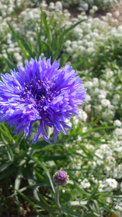 矢車草が、アリッサム畑の中で、、